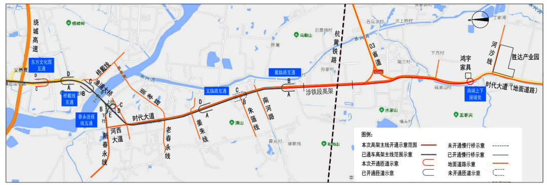 本次擬開通路段為時代大道南延(繞城至中環(huán)段)工程主線高架、東方文化園互通C、D匝道(約3.4公里),03省道改擴建下穿杭黃鐵路高架段(約1.06公里),共計全長約4.46公里。其中,東方文化園互通義橋方向上下匝道開通,高架主線保證雙向4車道通行,匝道保證單向一車道通行。
