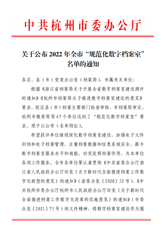 蕭山交投集團榮獲杭州市“規范化數字檔案室”