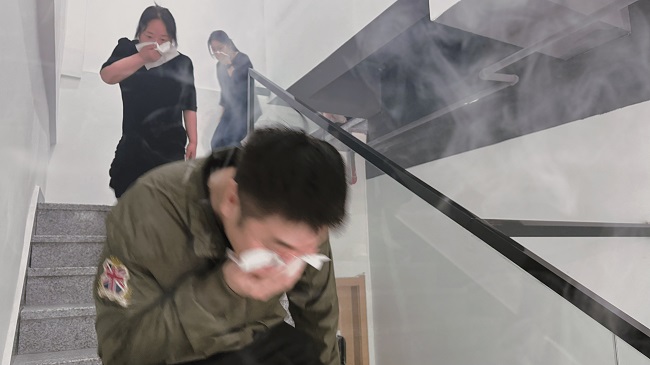 隨后開展的應急逃生演練模擬辦公區(qū)突發(fā)火情場景。煙霧彌漫后,全體職工迅速用濕毛巾捂住口鼻,彎腰低姿沿安全通道有序撤離,達到“快速反應、科學逃生”的預期目標。
